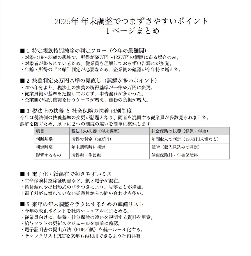 今年の年末調整について、例年以上に「ややこしい」「分かりにくい」「時間がかかった」という声を多くの企業から聞きました。すでに年末調整業務を終えている会社も多い時期ですが、「結局どこが大変だったのか」「何が混乱の原因だったのか」を整理しておくことは、次年度の負担軽減に直結します。